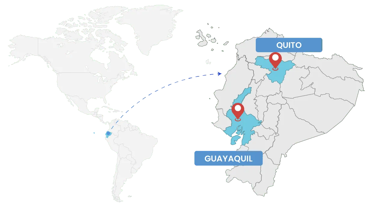 Strategic NearShore location with convenient time zone alignment with North America for seamless communication and short travel times from the US (less than 6 hours). Sites in Ecuador’s largest business hubs: Guayaquil and Quito.